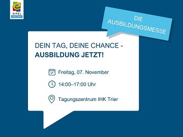 Am Freitag, den 7. November 2025, findet die Ausbildungsmesse „Dein Tag – Deine Chance – Ausbildung jetzt“ im IHK Tagungszentrum Trier statt. In der Zeit von 14:00 bis 17:00 Uhr haben ausbildungsinteressierte junge Menschen die Gelegenheit, sich umfassend über verschiedene Ausbildungsberufe und das Duale Studium zu informieren. Die Messe wird traditionell von der IHK Trier, der Handwerkskammer Trier, der Agentur für Arbeit Trier sowie dem Trierischen Volksfreund organisiert.