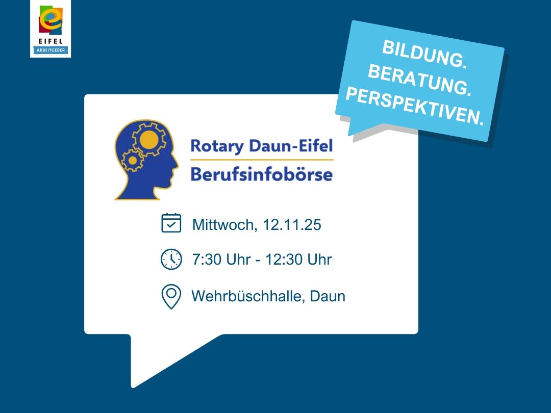 Die EIFEL Arbeitgeber freuen sich darauf, Sie bei der Berufsinfobörse 2025 begrüßen zu dürfen! Weitere Infos hier: Berufsinfobörse Rotary Daun-Eifel