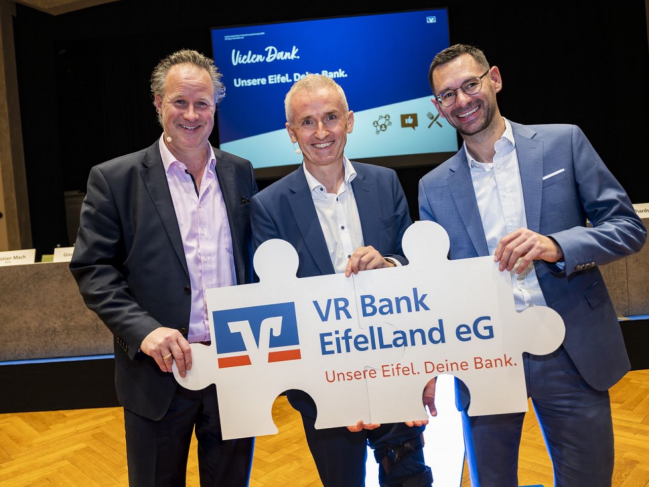 Bild (Ronald Larmann/pp/Agentur ProfiPress): Zwei Puzzleteile werden eins: Die Vorstände Jan Brandenburg (v.l.), Kai Zinken und Manfred Heinisch freuen sich auf den gemeinsamen Weg als VR Bank EifelLand.