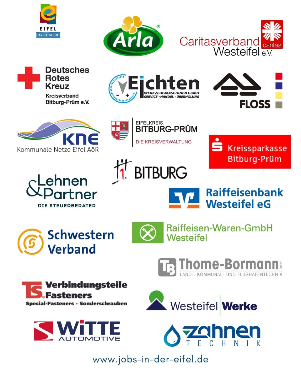 Arla Foods, Caritas Westeifel, DRK Bitburg-Prüm, Eichten Werkzeugmaschinen, Floß Holzbau, KNE Kommunale Netze, Kreisverwaltung Bitburg-Prüm, Kreissparkasse Bitburg-Prüm, Lehnen & Partner, Raiffeisenbank Westeifel, Raiffeisen Waren GmbH Westeifel, Schwesternverband, Stadtverwaltung Bitburg, Thome-Bormann, TS Verbindungsteile, Westeifel Werke, WITTE Automotive sowie Zahnen Technik.
