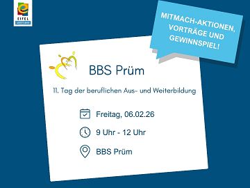 Am Freitag, 06. Februar 2026, findet an der Berufsbildenden Schule Prüm der 11. Tag der Aus- und Weiterbildung statt. Die Veranstaltung bietet Schülerinnen und Schülern eine wertvolle Gelegenheit, sich frühzeitig, praxisnah und direkt bei regionalen Betrieben über Ausbildungsberufe, duale Studiengänge und berufliche Perspektiven in der Eifel zu informieren.