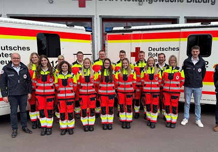 Foto (DRK): V.l.n.r.: Rainer Hoffmann (Kreisgeschäftsführer), Michelle Pütz, Leonie Schmitz (Azubis), Birthe Thomsen (Leitende Praxisanleiterin), Julia Weber (Azubi), Dennis Goedert (Praxisanleiter), Tabea Haas (Azubi), Andreas Scharbillig (Praxisanleiter), Jule Molitor, Niklas Simon, Pia Bungartz, Roman Lauer (alle Azubis), Lena Loch, Sven Arend, Jennifer Zimmer (Praxisanleiter), Moritz Igelmund und Thomas Nußbaum (Leitung Rettungsdienst)