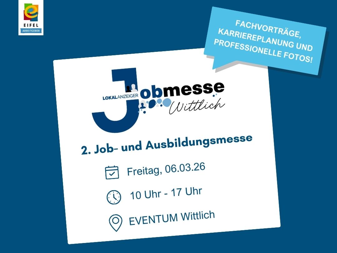 Jobsuchende aufgepasst: Am 06. März 2026 öffnet die 2. Job- und Ausbildungsmesse Wittlich im Eventum ihre Türen. Von 10 bis 17 Uhr präsentieren sich rund 30 Arbeitgeber aus der Region – darunter auch drei starke EIFEL Arbeitgeber: ARLA Foods, Goodyear Germany und die Hochschule Trier.