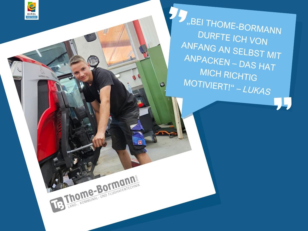 Ein Beispiel dafür ist Lukas, der sein Schulpraktikum als Mechatroniker für Land- und Baumaschinen bei Thome-Bormann absolviert hat. Seine Erfahrungen sprechen für sich: